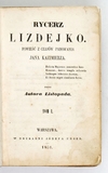 [RZEWUSKI Henryk] – Rycerz Lizdejko. Powieść z czasów panowania Jana Kazimierza przez Autora Listopada [pseud.]. T. 1-3 (w 1 wol.). Warszawa 1851-1852. W Drukarni Józefa Unger. 16d, s. 276; 286; 368. razem opr. psk. z epoki.