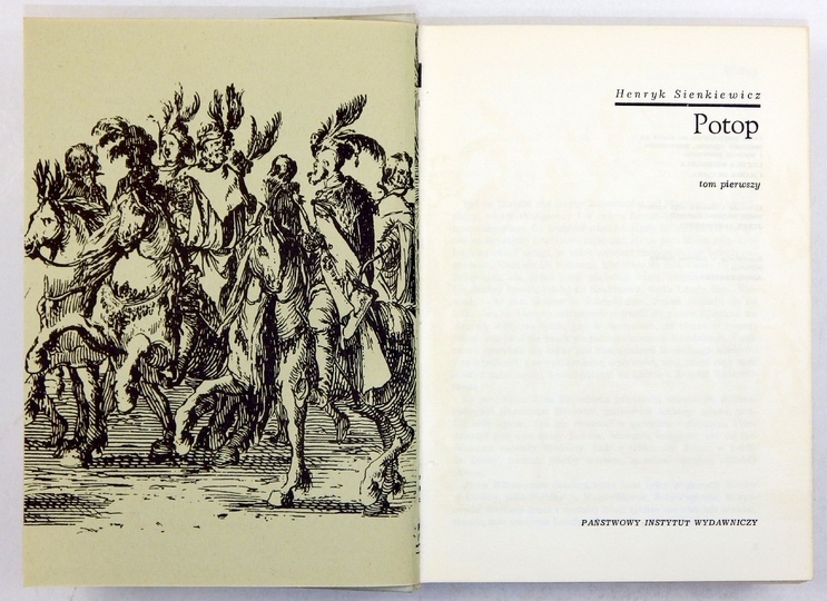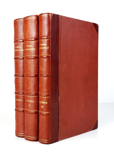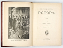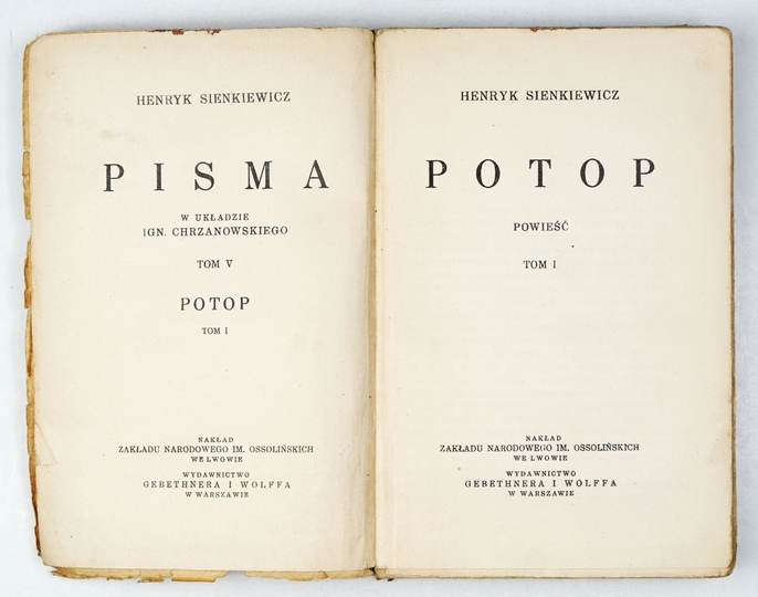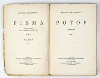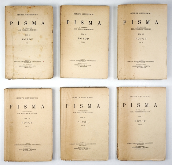 SIENKIEWICZ Henryk – Potop. Powieść. T. 1-6. Lwów 1929. Nakł. Zakładu Narodowego im. Ossolińskich. 16d, s. [4], 357; [4], 241; [4], 430; [4], 315; [4], 259; [4], 274. brosz. Pisma w układzie Ign. Chrzanowskiego, t. 5-10.