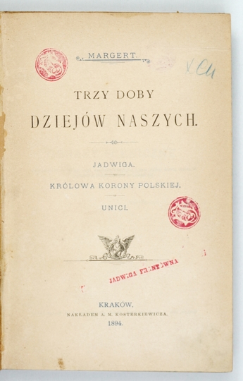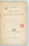 [SKÓRZEWSKA Maria Gertruda] Margert [pseud.] – Trzy doby dziejów naszych. Jadwiga. Królowa Korony Polskiej. Unici. Kraków 1894. Nakł. A. M. Kosterkiewicza. 8, s. [4], 113; 155; 144, [1]. opr. późn. ppł.