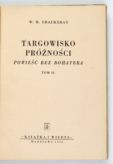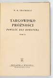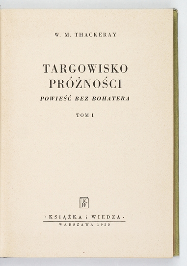 THACKERAY W[illiam] M[akepeace] – Targowisko prózności. Powieść bez bohatera. T. 1-2. Warszawa 1950. Książka i Wiedza. 8, s. 359, [1]; 458, [1]. opr. oryg. pł., obw.