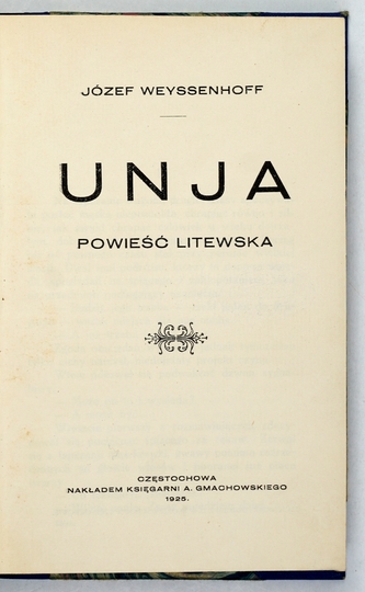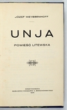WEYSSENHOFF Józef – Unja. Powieść litewska. Częstochowa 1925. Nakł. Księg. A. Gmachowskiego. 16d, s. [4], 375. opr. ppł. z epoki.
