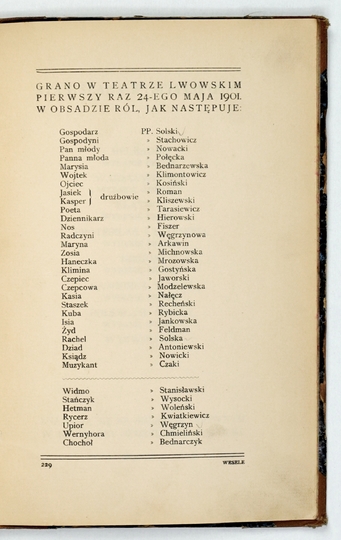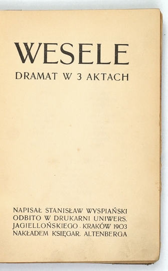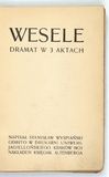WYSPIAŃSKI Stanisław – Wesele. Dramat w 3 aktach. Kraków 1903. Nakł. Księg. H. Altenberga. 8, s. 229, [2]. opr. opóźn. ppł.