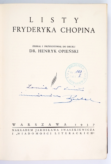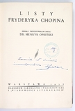 CHOPIN Fryderyk – Listy ... Zebrał i przygotował do druku Henryk Opieński. Warszawa 1937. Nakł. J. Iwaszkiewicza i "Wiadomości Literackich". 8, s. VII, [1], 373, [1], tabl. 15. opr. ppł. z epoki.