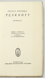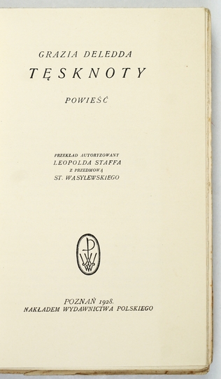 DELEDDA Grazia – Tęsknoty. Powieść. Przekład autoryz. L. Staffa. z przedmową St. Wasylewskiego. Poznań 1928. Wyd. Polskie. 8, s. VII, [1], 272, [4]. brosz. Bibljot. Laureatów Nobla, t. 62.