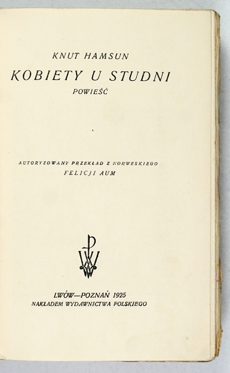HAMSUN Knut – Kobiety u studni. Powieść. Autoryzowany przekład Felicji Aum. Lwów-Poznań 1925. Wyd. Polskie. 8, s. 508, [4]. brosz. Bibliot. Laureatów Nobla, t. 35.