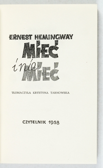 HEMINGWAY Ernest – Mieć i nie mieć. Tłum. Krystyna Tarnowska. Warszawa 1958. Czytelnik. 16d, s. 233, [2]. brosz., obw.