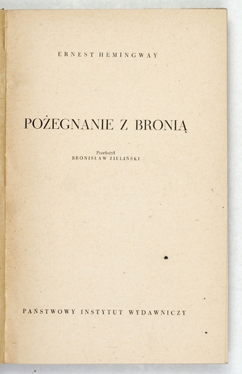 HEMINGWAY Ernest – Pożegnanie z bronią. Przeł. B. Zieliński. Warszawa 1957. PIW. 8, s. 348, [2]. brosz., obw.