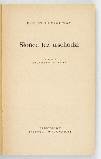 HEMINGWAY Ernest – Słońce też wschodzi. Przeł. B. Zieliński. Warszawa 1958. PIW. 8, s. 274. brosz., obw.