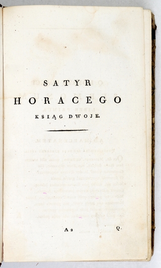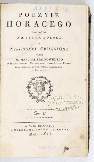HORACY – Poezyie ... przełożone na język polski i przypisami obiaśnione przez M. Marcina Fiałkowskiego. T. 2. Wrocław 1818. Wilhem Bogumił Korn. 8, s. [2], 544, [2]. opr. psk. z epoki.