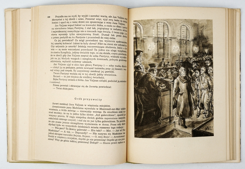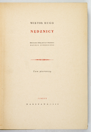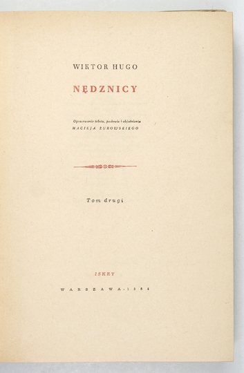 HUGO Wiktor – Nędznicy. Opracowanie tekstu, posłowie i objaśnienia Macieja Żurowskiego. T. 1-2. Warszawa 1954. Iskry. 8, s. [2], 333, tabl. 8; 439, tabl. 8. opr. oryg. pł., obw.