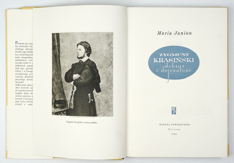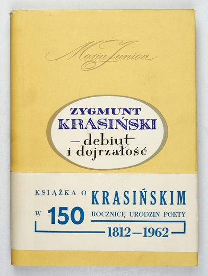 JANION Maria – Zygmunt Krasiński, debiut i dojrzałość. Warszawa 1962. Wiedza Powszechna. 8, s. 274, [2]. opr. oryg. pł., obw.