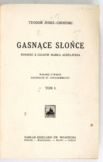 JESKE-CHOIŃSKI Teodor – Gasnące słońce. Powieść z czasów Marka Aureliusza. Wyd, IV. Ilustracje St. Sawiczewskiego. T. 1-2 (w 1 wol.). Poznań [i in.] [1928]. Księg. św. Wojciecha. 16d, s. [2], 275, tabl. 5; [2], 252, tabl. 5. razem opr. późn. ppł.