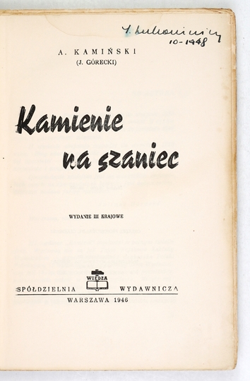 KAMIŃSKI Aleksander (Juliusz Górecki) – Kamienie na szaniec. Wyd. III krajowe. Warszawa 1946. Sp. Wyd. Wiedza. 8, s. 208. brosz.