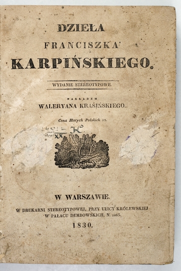 KARPIŃSKI Franciszek – Dzieła ... Wyd. stereotypowe Waleryana Krasińskiego. Warszawa 1830. Druk. Stereotypowa. 8, s. [2], X, 9, [1], 467, [3], tabl. 1. opr. pł. z epoki.