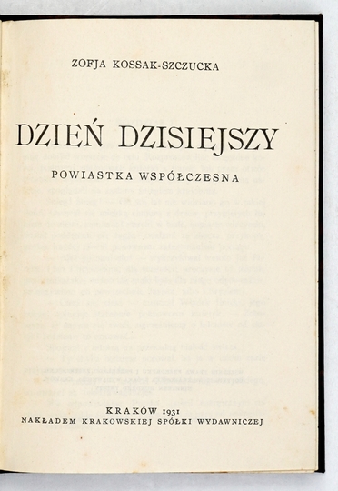 KOSSAK-SZCZUCKA Zofja – Dzień dzisiejszy. Powiastka współczesna. Kraków 1931. Krakowska Spółka Wyd. 16d, s. [4], 280. opr. późn. ppł.