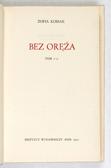 [oraz] tKOSSAK Zofia - Bez oręża. T. 1-2 (w 1 wol.). Warszawa 1971. PAX. 8, s. 196, [2]; [199]-218, [2]. opr. oryg. pł., obw.