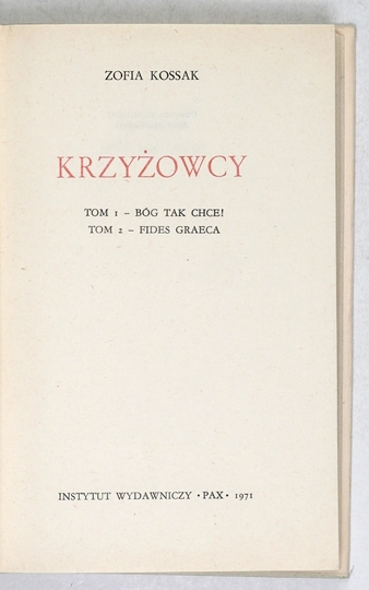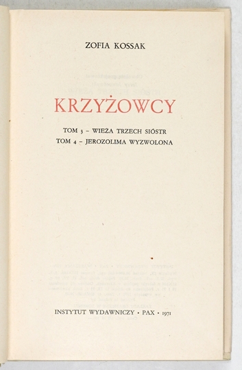 KOSSAK Zofia – Krzyżowcy. T. 1-4 (w 2 wol.). Warszawa 1971. PAX. 8, s. 175, [1]; [177]-381, [1]; 215, [1], [217]-423, [5]. opr. oryg. pł. obw.