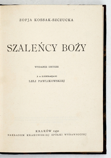 KOSSAK-SZCZUCKA Zofja – Szaleńcy boży. Wyd. II. Z 12 ilustracjami Leli Pawlikowskiej. Kraków 1930. Krakowska Spółka Wyd. 16d, s. [4], 226, [2], tabl. 12. opr. późn. ppł.