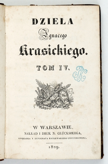 KRASICKI Ignacy – Dzieła ... Edycya nowa i zupełna podług wydania Franciszka Dmochowskiego. T. 4. Warszawa 1829. Nakł. i Druk N. Glücksberga. 16d, s. [4], IV, 294, [10]. opr. psk. z epoki, z szyldzikami.