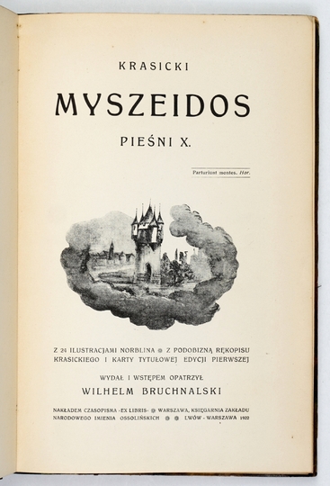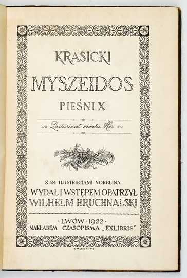 KRASICKI [Ignacy] – Myszeidos pieśni X. Z 24 ilustracjami Norblina, z podobizną rękopisu Krasickiego i karty tytułowej edycji pierwszej. Wydał i wstępem opatrzył Wilhelm Bruchnalski. Lwów-Warszawa 1922. Nakł. czasopisma "Ex-libris". 8, s. XLIII, [5], 112, tabl. 11. opr. nieco późn. ppł. z zach. okł. brosz.