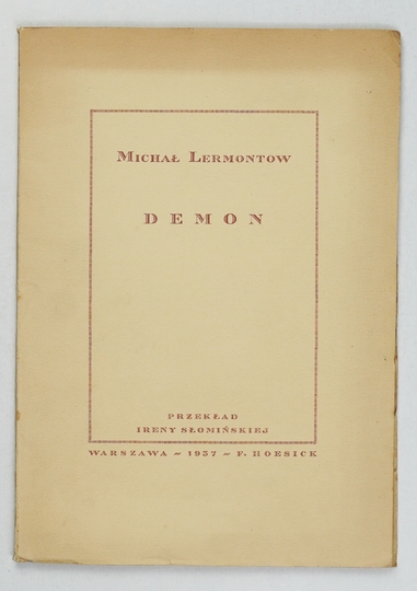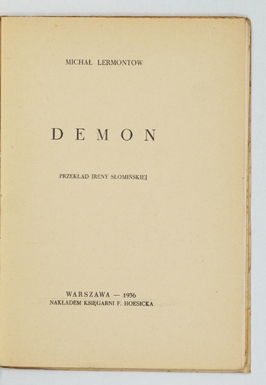 LERMONTOW Michaił – Demon. Przekład Ireny Słomińskiej. Warszawa 1936. Nakł. Księgarni F. Hoesicka. 8, s. 45. brosz.