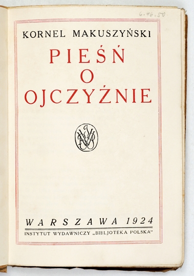 MAKUSZYŃSKI Kornel – Pieśń o Ojczyźnie. Warszawa 1924. Instytut Wydawniczy "Bibljot. Polska". 16d, s. 203. brosz.