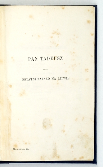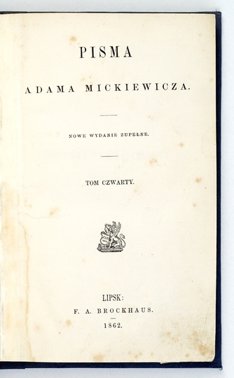 MICKIEWICZ Adam – Pisma. Nowe wyd. zupełne. T. 4: Pan Tadeusz. Lipsk 1862. F. A. Brockhaus. 16d, s. [6, 319. opr. wsp. pł., fragm. okładek oryg. naklejono na oprawę. Bibliot. Pisarzy Polskich, t, 11.