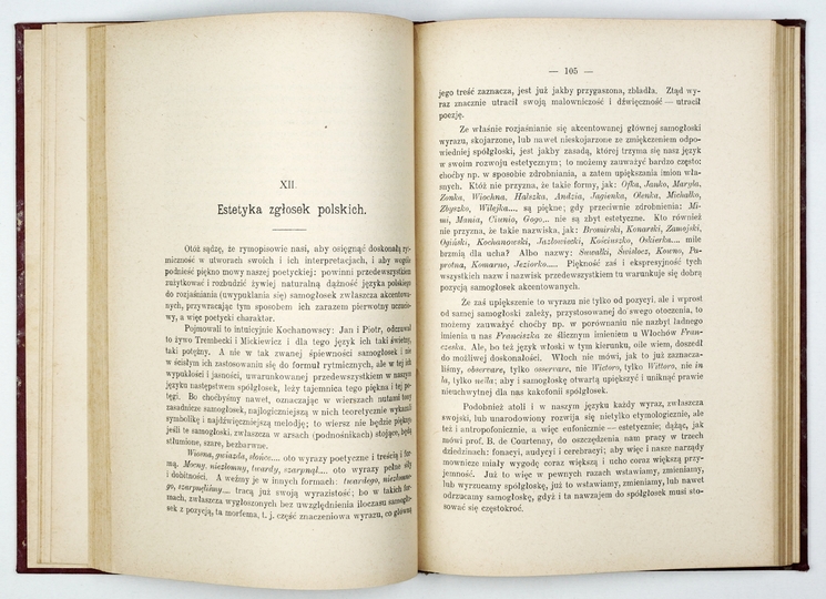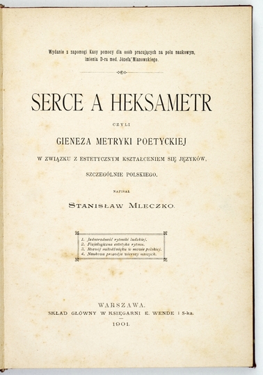 MLECZKO Stanisław – Serce a heksametr czyli gieneza metryki polskiej w związku z estetycznym kształceniem się języków, szczególnie polskiego. Warszawa 1901. Kasa im. Mianowskiego. Druk. Rubieszewskiego i Wrotnowskiego. 8, s. XXII, [2],305, [1]. opr. nieco późn. kart.