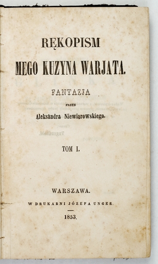 NIEWIAROWSKI Aleksander – Rękopism mego kuzyna warjata. Fantazja. T. 1-2 (w 1 wol.). Warszawa 1853. Druk. Józef Unger. 16d, s. [10], 157; [4], 138. opr. późn. pł.