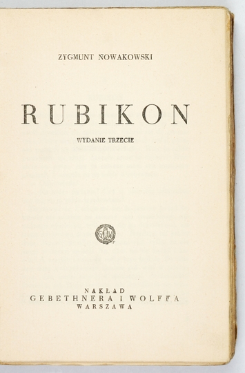 NOWAKOWSKI Zygmunt – Rubikon. Wyd. III. Warszawa [1939]. Nakł. Gebethnera i Wolffa. 8, s. 269, [3]. brosz.