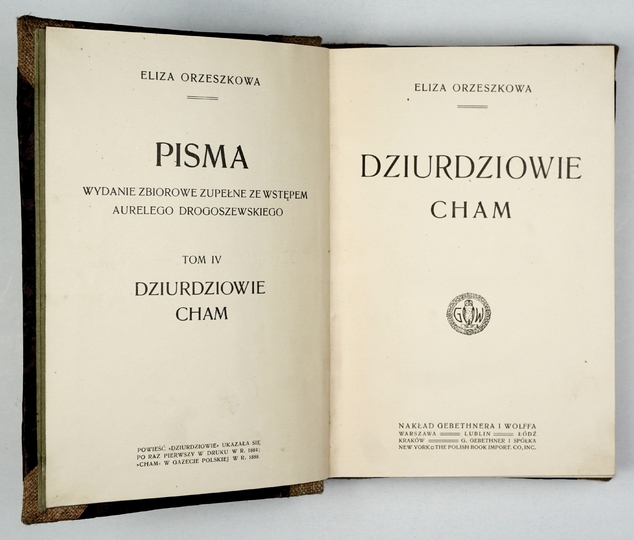 ORZESZKOWA Eliza – Dziurdziowie. Cham. Warszawa [i in.] 1912. Nakład Gebethnera i Wolffa. 8, s. [4], 337. opr. późn. ppł. Pisma. Wydanie zbiorowe zupełne ze wstępem Aurelego Drogoszewskiego, t. 4 .