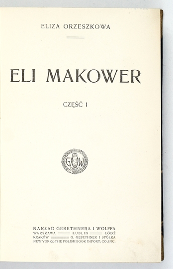 ORZESZKOWA Eliza – Eli Makower. Cz. 1-2 (w 1 wol.). Warszawa [i in.] 1912. Nakł. Gebethnera i Wolffa. 8, s. [4], 230; [4], 258. razem opr. późn. ppł. Pisma. Wydanie zbiorowe zupełne ze wstępem Aurelego Drogoszewskiego, t. 6-7.