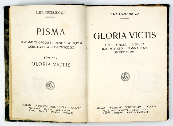ORZESZKOWA Eliza – Gloria Victis. Oni, Oficer, Hekuba, Bóg wie kto, Panna Róża, Śmierć domu. Warszawa [i in.] 1928. Nakł. Gebethnera i Wolffa. 16d, s. 305, [2]. opr. późn. ppł. Pisma. Wydanie zbiorowe zupełne ze wstępem Aurelego Drogoszewskiego, t. 25.