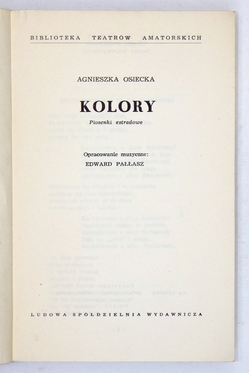 OSIECKA Agnieszka – Kolory. Piosenki estradowe. Oprac. muzyczne: Edward Pałłasz. Warszawa 1962. Ludowa Spółdzielnia Wydawnicza. 16d, s. 242, [10]. brosz. Bibliot. Teatrów Amatorskich.