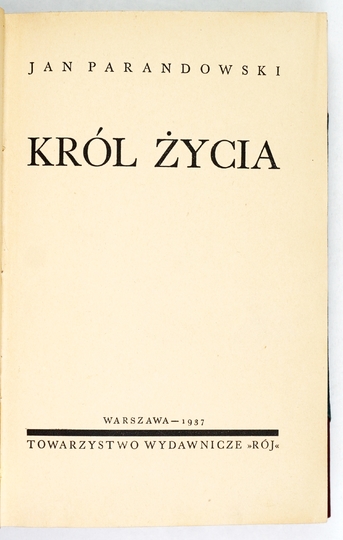 PARANDOWSKI Jan – Król życia. Warszawa 1937. Tow. Wyd. "Rój". 16d, s. 318, [1]. opr. psk. z epoki.