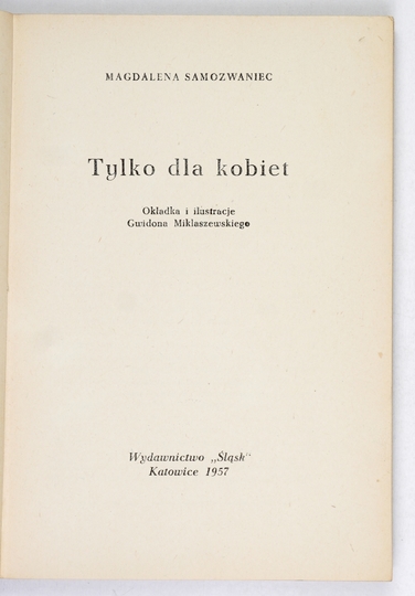 SAMOZWANIEC Magdalena – Tylko dla kobiet. Okładka i ilustracje Gwidona Miklaszewskiego. Katowice 1957. Wydawnictwo "Śląsk". 8, s. 187, [5]. brosz.