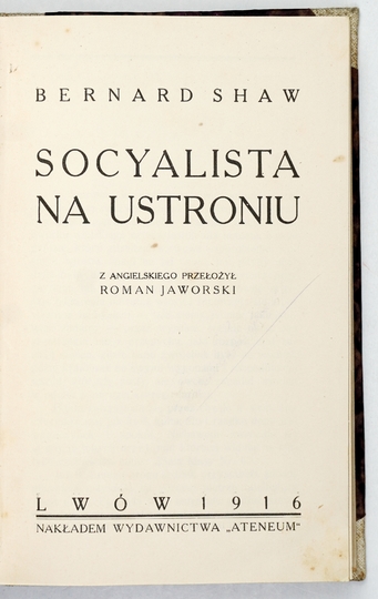 SHAW Bernard – Socyalista na ustroniu. Z angielskiego przeł. Roman Jaworski. Lwów 1916. Ateneum. 8, s. [4], 418. opr. nieco późn. bibliot. ppł.