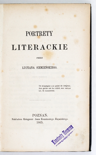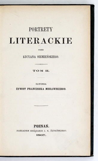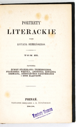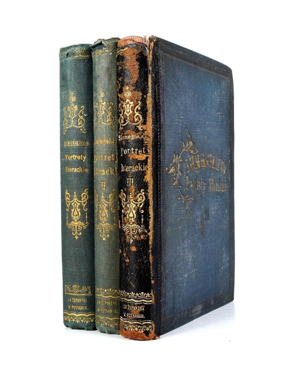 SIEMIEŃSKI Lucyan – Portrety literackie. T. 1-3. Poznań 1865-1868. Księg. J. K. Żupańskiego. 16d, s. VIII, 538, [1]; 374; 410. opr. oryg. pł. złoc (t. 1-2), opr. oryg. psk. złoc. (t. 3).