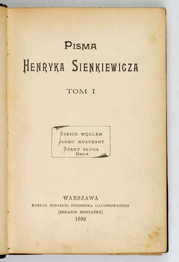SIENKIEWICZ Henryk – Pisma. T. 1: Szkice węglem, Janko Muzykant, Stary sługa, Hania. Warszawa 1899. Red. Tygodnika Illustrowanego. 16d, s. 242, [1]. opr. psk. z epoki.