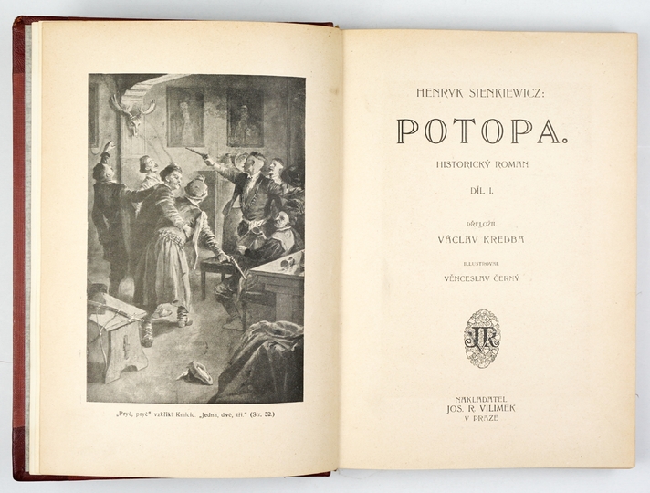 SIENKIEWICZ Henryk – Potopa. Historický román. Dil 1-3. Přelozil Vaclav Kredba. Illustroval Vénceslav Černý. Praha 1925. J. R. Vilímek. 8, s. 380; 424; 334. opr. nieco późn. psk., górne obcięcie barwione.