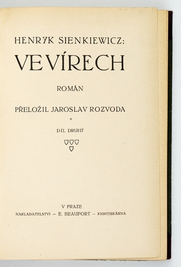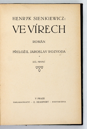 SIENKIEWICZ Henryk – Ve virech. Roman. Přeložil Jaroslav Rozvoda. Dil. 1-2. Praha [1910]. Nakladatelstvi E. Beaufort. 16d, s. 309, [3]; 319. opr. oryg. ppł. z zach. okł. brosz.