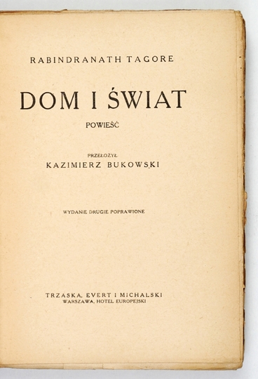 TAGORE Rabindranath – Dom i świat. Przełożył Kazimierz Bukowski. Wyd. II poprawione. Poznań 1922. Trzaska, Evert i Michalski. 16d, s. [4], 265, [3]. brosz.