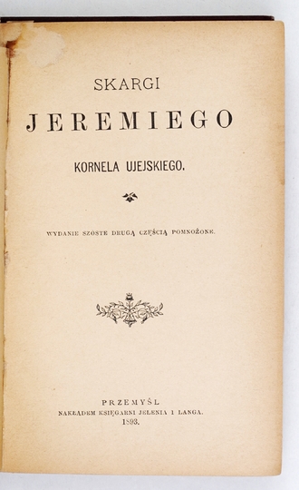UJEJSKI Kornej – Skargi Jeremiego. Wyd. VI drugą częścią pomnożone. Przemyśl 1893. Nakł. Księg. Jelenia i Langa.16d, s. [8], 89, [2], tablica 1 (portret)