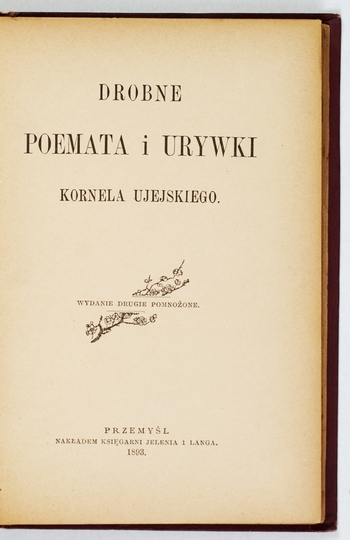 [oraz współwyd.] tenże - Wiersze różne. Wyd. II pomnożone. Przemyśl 1893. Księg. Jelenia i Langa. 16d, s. 195, [5]. razem oprawne, opr. oryg. pł. zdob., złoc.