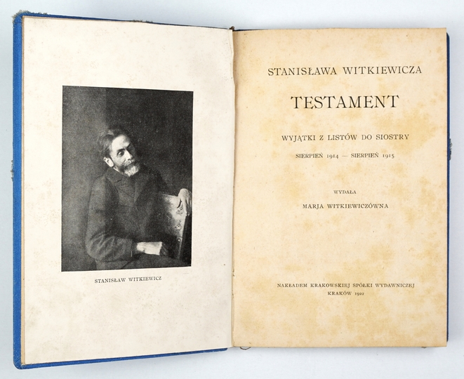 WITKIEWICZ Stanisław – Testament. Wyjątki z listów do siostry sierpień 1914-sierpień 1915. Wydała Marja Witkiewiczowa. Kraków 1922. Krakowska Spółka Wyd. 8, s. [6], 64, tabl. 1. opr. pł. z epoki.