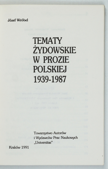 WRÓBEL Józef – Tematy żydowskie w prozie polskiej 1939-1987. Kraków 1991. Towarzystwo Autorów i Wydawców Prac Naukowych "Universitas". 8, s. 189. brosz.