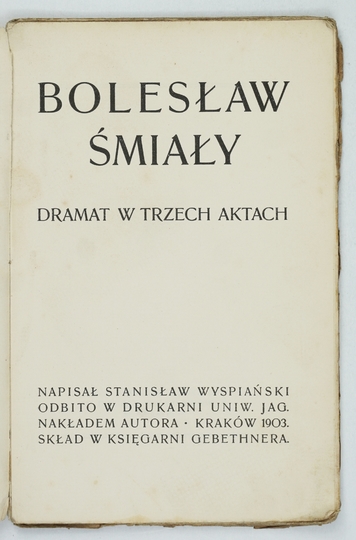 WYSPIAŃSKI Stanisław – Bolesław Śmiały. Dramat w trzech aktach. Kraków 1903. Nakł. autora. 8, s. 104, [6]. brosz.