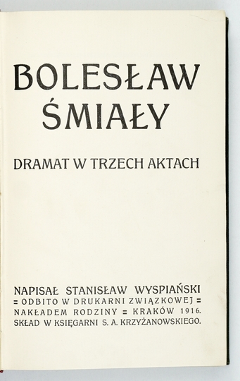 WYSPIAŃSKI Stanisław – Bolesław Śmiały. Dramat w trzech aktach. Kraków 1916. Nakł. rodziny. 8, s. 104, [5]