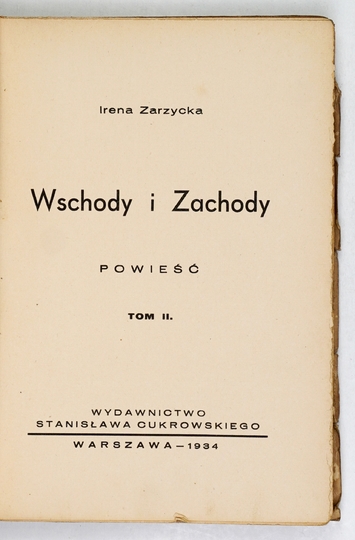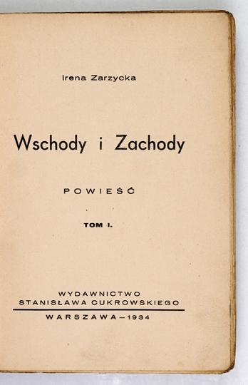 ZARZYCKA Irena – Wschody i Zachody. Powieść. Tom 1-2. Warszawa 1934. Wyd. S. Cukrowskiego. 16d, s. 253, [3]. razem zbrosz. Bibljoteka Nowości w Warszawie, nr 294-295.