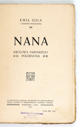 ZOLA Emil – Nana. Królowa paryskiego półświatka. Warszawa-Łódź 1910. Tłumaczenie, nakład i własność Cz. Mastelskiego. 16d, s. 380. brosz.